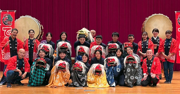 獅子舞では学生さん+先生総勢12名のご協力をいただき、でん舎メンバーと合わせて16頭の獅子が客席を練り歩きました。1,800名の生徒さん全員を噛むことはできませんでしたが、会場内を大いに沸かせることに成功しました。